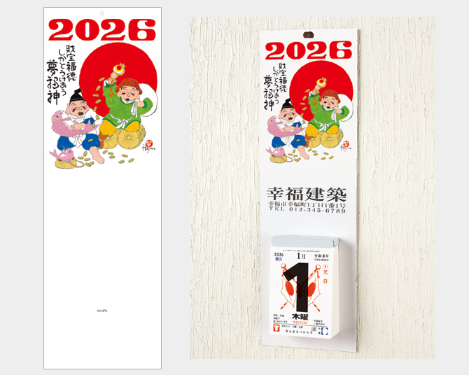 NK日めくりカレンダー専用台紙 小日表と一緒にお好きな台紙をお選び下さい。台紙にカレンダーを取付ける昔ながらの定番商品です。 日めくりカレンダー専用台紙一覧 NK-205 小判と二福神 サイズ:菊/12切(310×150mm)幸運や商売繁盛を象徴する縁起の良い二福神の絵柄をあしらった専用台紙。日めくりNK-2・NK-3が取付可能となっております。※壁掛け用天穴付 NK-211 空押金年号 サイズ:46/16切(260×170mm)シンプルな台紙にゴールドで年号をあしらった専用台紙。日めくりNK-3が取付可能となっております。※箔ハトメ・天穴付 NK-218 金枠角丸赤年号 サイズ:46/12切(310×180mm)金の縁で飾り、赤で年号を入れた専用台紙。日めくりNK-3が取付可能となっております。※箔ハトメ・天穴付 NK-278 切取台紙 水墨二福神 サイズ:46/16切(382×125mm)岡本肇の水墨七福神シリーズ。縁起の良い二福神の絵柄をあしらった専用台紙。日めくりNK-2・NK-3が取付可能となっております。※壁掛け用天穴付 NK-335-6 日めくりスタンド サイズ:145×71mm(展開145×208mm)名入れサイズは18×55mm以内、箔押し。日めくりNK-2・NK-3が取付可能となっております。※日表別売、天穴、日表取付穴付・OPP袋付 ※お気軽にお問合せください