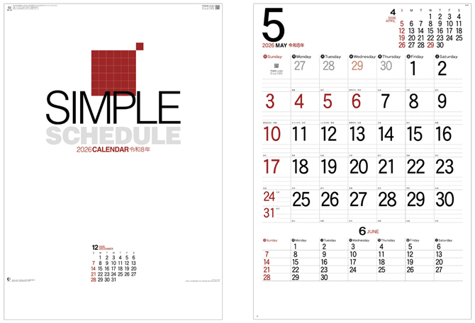 シンプル&モダン。モノトーンの落ち着いた配色でメモ欄も充実。カレンダーには前後月も入り、大変便利です。六曜・主要行事入り。ホットメルト製品。